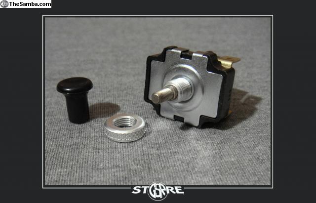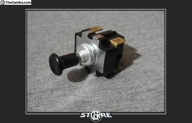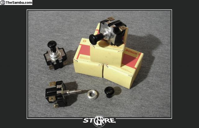 This is a new Bosch pull-push wiper switch for 356 Porsche's. Black bakelit, spade terminals, small version with black knob.