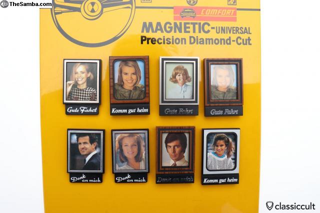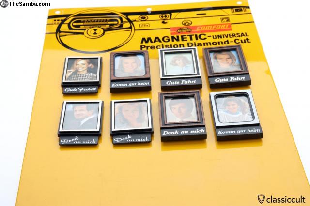 new old stock dashboard photo frame, stamped with "Gute Fahrt" (Have a safe trip), "Komm gut heim" (Get home safe) or "Denk an mich" (Think of me), about 6 x 4 cm, you can mount it on a metal dashboard with the rear magnet, alternatively, the thin metal plate with sticker comes between dash and magnet, Made in Germany in the 70ies, please tell me which one you want after ordering, +20 USD shipping