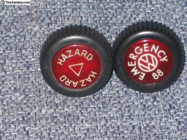 I have 2 original VW issue Hazard Knobs--all are complete with the working Bulb and the Red Indicator Insert for T-1 '68-'77; SuperBeetles '71-'72; Karmann Ghia '68-'74; T-3 '68-'73--as follows: (shafts of each knob are the same length. It is the knob itself that varies, so please note the 2 types of knobs. The differences will be seen on the backs of the knobs and the Hazard Logo)