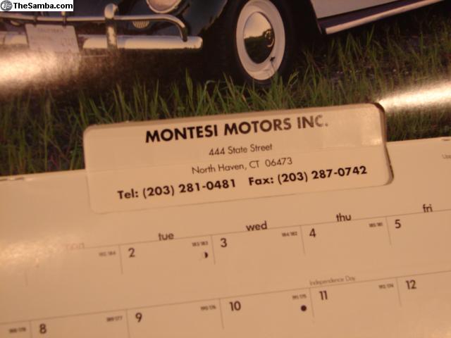 This calendar has a die-cut "window" at the center that shows the dealer's name no matter what month you're looking at--in this case it is Montesi Motors of North Haven, CT.