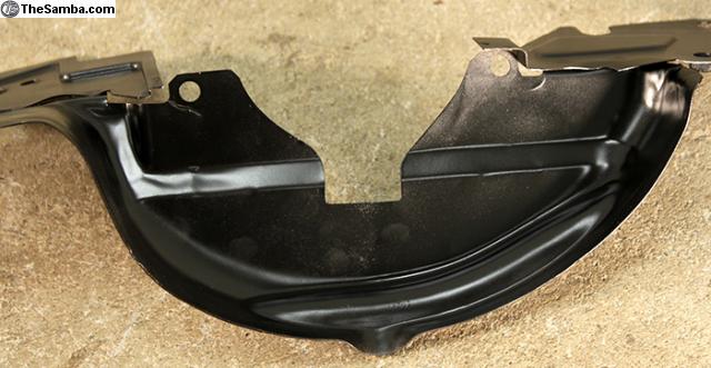 Crank pulley engine tin for a fuel-injected Bug or Super Beetle. There are a few small cracks by the screw holes (pictured), otherwise it is in good shape. We have crank pulley tin available for other years of cars as well (the picture with several different tins shows other styles).