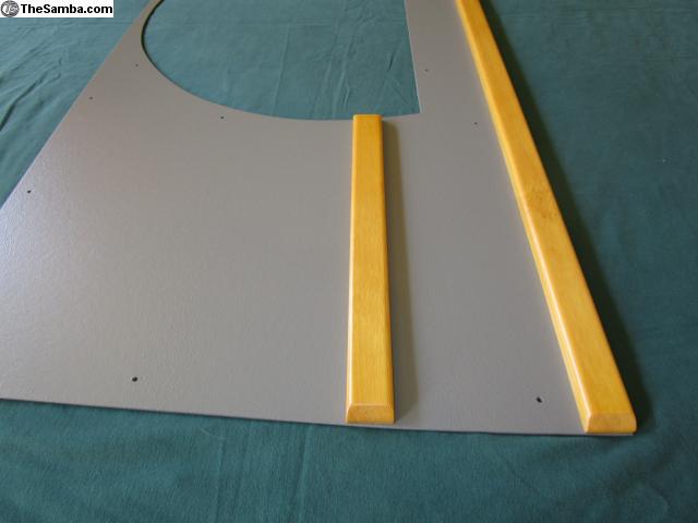 It comes painted grey with varnished wood trim strips. It is pre-drilled for screws.