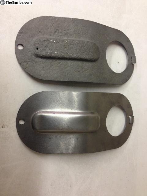 Here is a new reproduction of the often rotten or missing steering column cover plate that is used in buses from 1955 into early 1959. Somewhere in 59 this was discontinued. If your floor does not have a hole this shape for the steering column to go through then you will not need this.