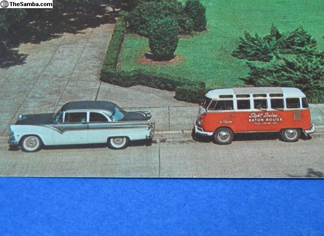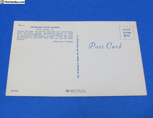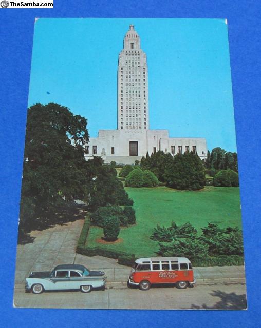 NOS - never used !! Very cool postcard from the Louisiana State Capitol. Probably dates from the late 1950's or very early 1960's. Best of all there is a 23 window Deluxe Micro Bus in the image. It has logos down the side that says "Sight Seeing Baton Rouge". Bus also has bullet front turn signals. Great early VW collectible.