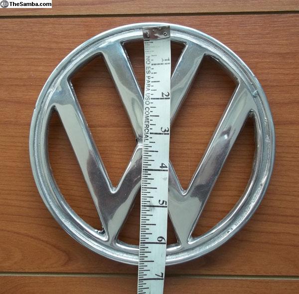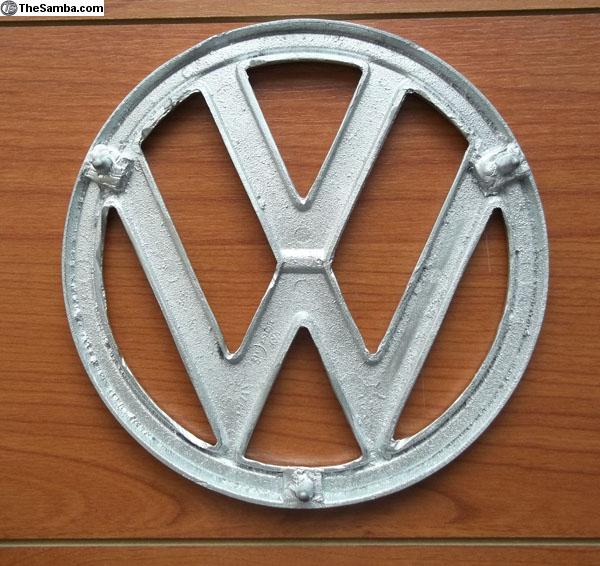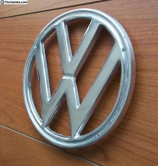 Now up for sale an aluminum front emblem reproduction for ´73 to´79 Bay window buses ( 6 1/2 in. diameter ). Made in cast aluminum high polished and comes with three posts on the back for installation. ( washers included ).
