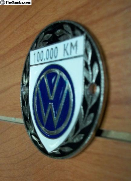 Now for sale a nice badge : Volkswagen 100,000 kilometers badge, finest reproduction, comes with two small holes on sides for installation, like the originals, article which gave Volkswagen to their cars during the early 50's, as the VW's distinctive reaching this mileage, this emblem is placed on the dash, necessary to make two small holes for this.
