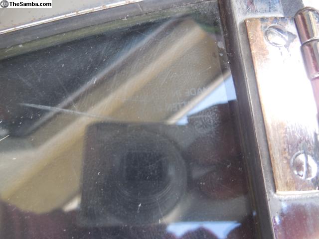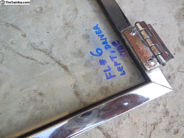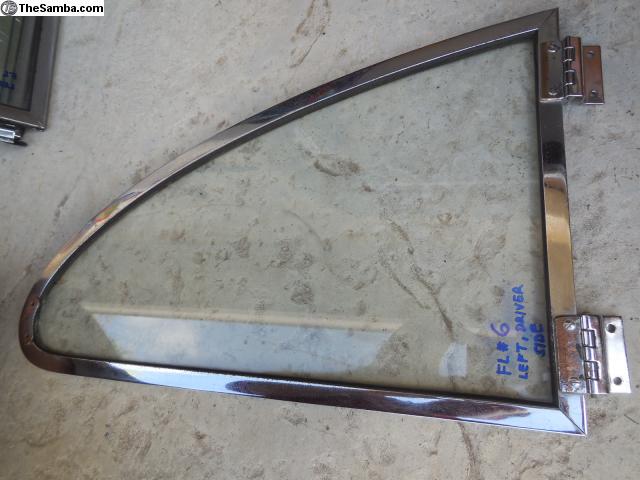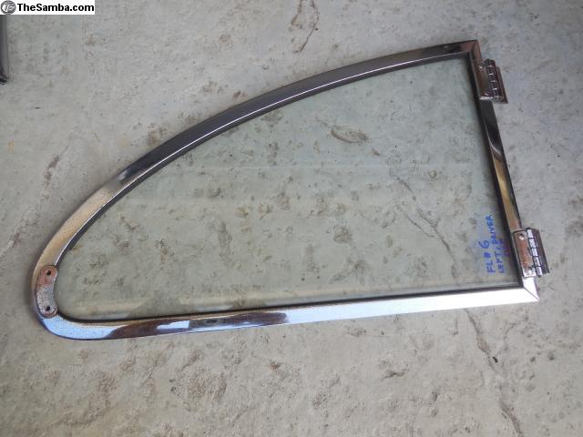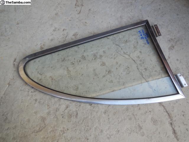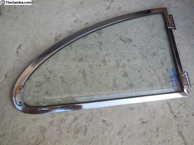 used Porsche 356 Rear Vent Window( Left,Driver Side )...glass is original SIGLA...there is scratches present...some scratches are deep..frame is in good condition..some scratches present...some chrome pitting present...use as is or re chrome...