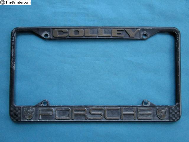 This is a very hard to find original dealer licence plate frame from Colley Porsche out of Riverside, CA. The Porsche dealership was short lived, because Carl Colley passed away and the family could not hang on to it. The family still owns Colley Ford in Glendora today.