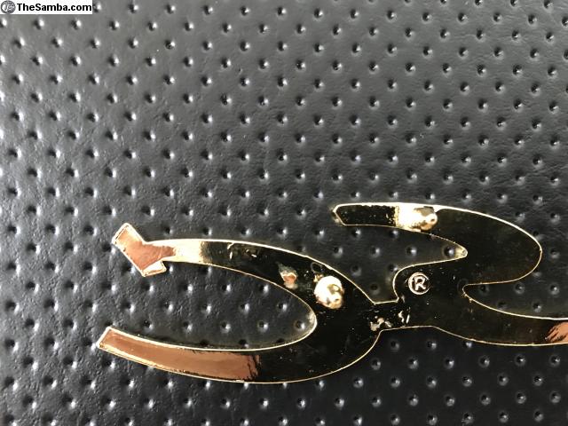 These are the original with circle “R” emblems just freshly gold plated and ready to mount on your car. This is the 200mm with 2 pins version for 1964-65 356SC. I also have other emblems available, please let me know which one/ones you’re looking for.
