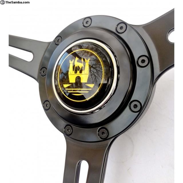 The boss / adapter is not cast like others, this are machined for perfect fit and also taper them so they line up neatly with your original steering column. The horn push does not get forgotten either, we have produced it with the same Wolfsburg logo as on vintage stock steering wheels but encased in billet aluminium so sits perfectly with the wheel.