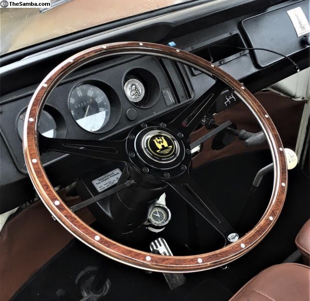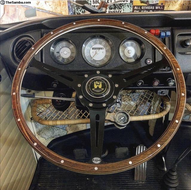 Black Wolfsburg steering wheels by AAC are the deluxe option that VW should have offered back in the day and look right at home against the dash in your bus.