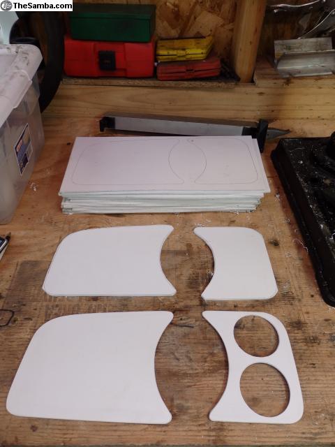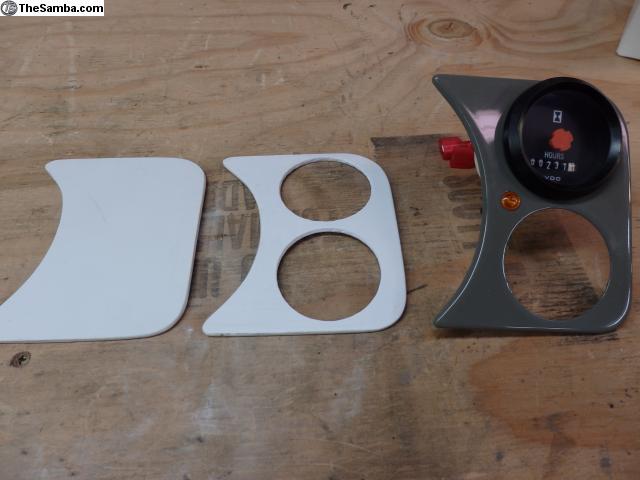 These are custom gauge panels that you can cut for any combination of gauges, switches, or indicator lights. They are made from 1/8" thick foamed PVC sheet/PVC foam board. They are very lightweight and can be cut, sanded and shaped very easily. I even put a slight bend in them to match the contour of the dash. They accept paint extremely well and look great when finished. They are most easily attached to the dash with double sided tape. May require final sanding and fitting.