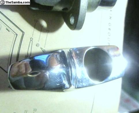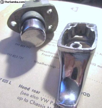 Genuine German Volkswagen. NewOldStock NOS. One (1) Part Number 113 827 503, Lock-Rear Hood/Engine Compartment Lid-chromium plated AND One (1) Part Number 113 827 507 A Engine Compartment lock handle. Applicable for Type 1 Beetle from Chassis Number 115 000 001 up to Chassis Number 116 1021 300 (August 1964 Model Year 1965 through July 1966 Model Year 1966) two years applicability. Also applicable for Type 2 Bus from Chassis Number 216 000 001 to 216 190 000 Model year 1966. The chrome part is the push in piece of unit! Non Locking. The chrome lift handle is a separate part number (113 827 507 A number 80 Illustrated Parts List) and not normally or ususlly an integral part of the lock! It appears that VW considered the locking device to need replacing more often than the chrome handle-therefore rarely are they together! However they did make some Spare Parts with the chrome handle included. To obtain a keyed/lockable lock one had to specify Special Options Code M 94 (Handle for rear lid lockable). Most vehicles originally came without the lockable version!! Number 75 (20 for Bus) Illustrated Parts List refers. Lock and Handle only no Screws, no packing! Ensure Application. $46MailedLower48. USPSMO.