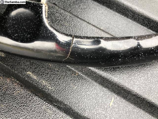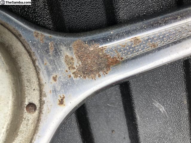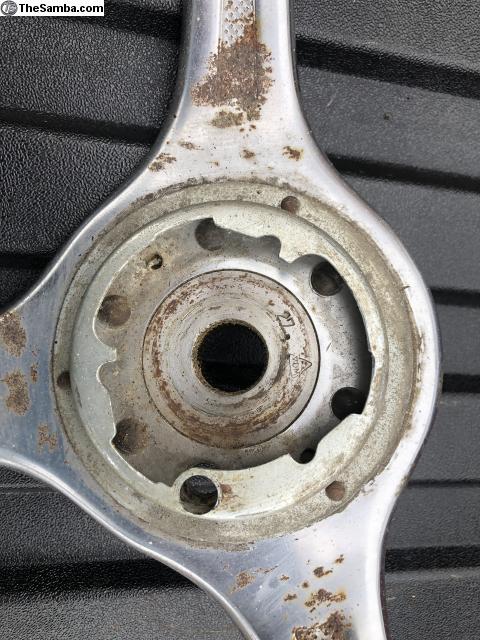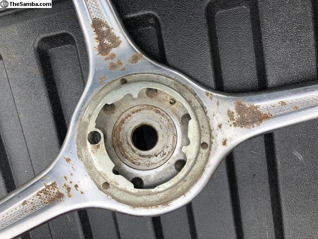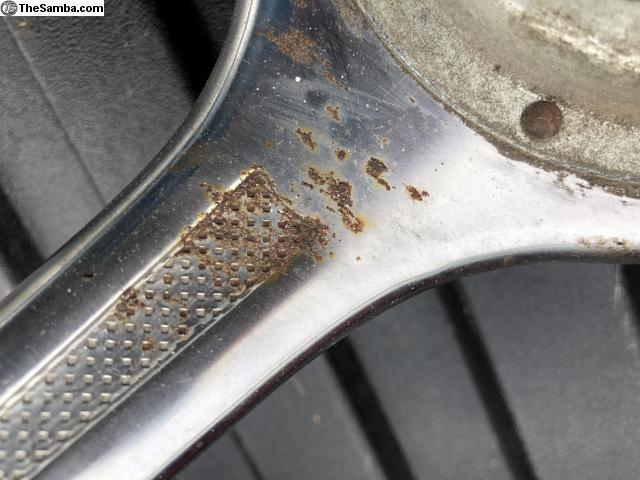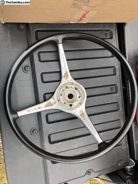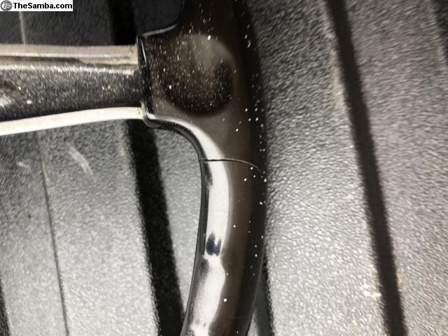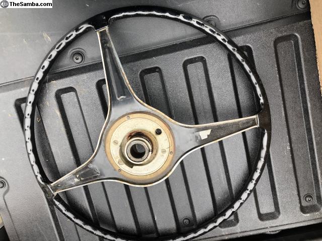 steering wheel...not polished in anyway. two small cracks, but otherwise, not sun beaten. nice gloss still on black part. some white paint dots from