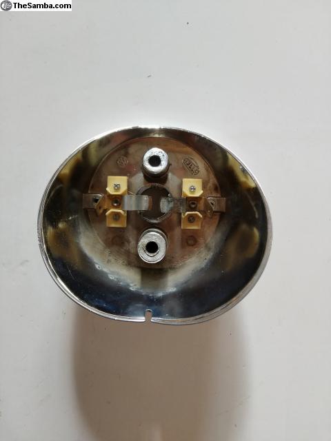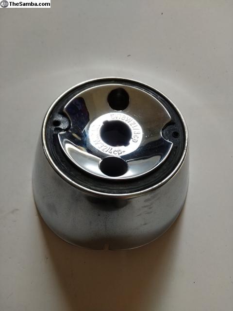 Here is a single passenger side turn signal housing. This housing is dual filament and correct for '68-'69 type 3s. The chrome has light spotting, but is in decent condition. Includes lens seal.