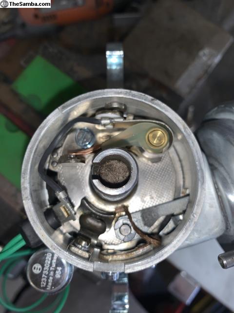 This is a refurbished and restored Original Bosch DVDA distributor. The distributor was completely disassembled and each part cleaned spotless. This distributor was found to be in excellent condition. No wear on the points cam, pivot plate or advance weights. New fiber washers for the advance weights and a new, correct bakelite advance weights slide plate were installed. During reassembly, both mainshaft fiber washers were installed. The appropriate spots were re-lubricated with Bosch grease or oil. The exterior clips, screws, drive dog and it's spring had their remaining zinc coating stripped off. They were then re bright zinc plated. This distributor is in like new condition inside and out.