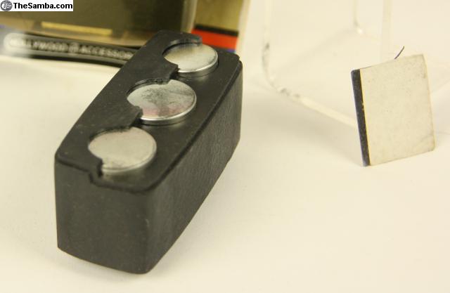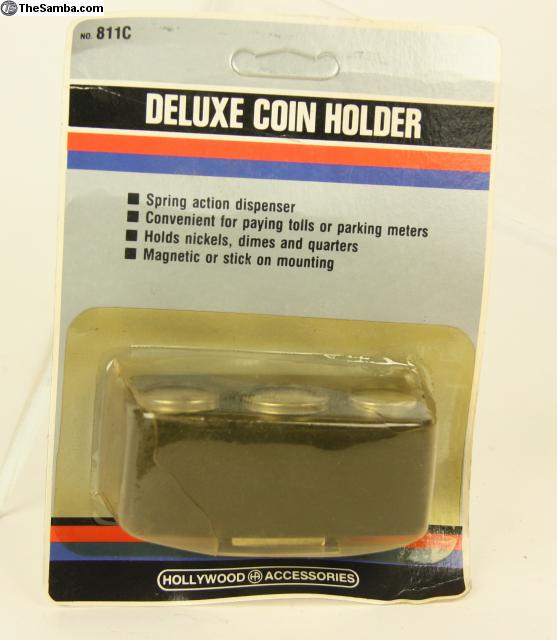 This is a NOS coin holder. It is still on the card and the card never was "punched" to hang. IT has a stick on piece of metal to attach to a plastic dash and use the magnet or just use you "real" metal dash. The card has some bends and the gel is yellowed and has a crack. The loose one is just for reference, you will just get the one on the card.