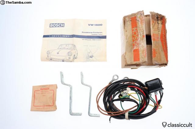 VW Type 3 Fanfare Horn mount kit, new old stock, complete with two horn brackets, switch, 6V relay, cable, small mount parts, instructions and box, +40 USD shipping