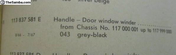 Genuine German Volkswagen: NewOldStock NOS: Part Number 113 837 581 E. Two (2), One Set/Pair of Door Window Winder handles (inside door panel). One Year Only from Chassis Number 117 000 001 to 117 999 000 Model Year 1967 for Models 113, 114, 117, 118, 151 and 152. Plastic knob Color Code 043, grey-black. Backside has VW emblem and casting number 113.837.583 A. Boxed, Genuine Mint NewOldStock NOS. May or May not have minute scratches after 50 plus years in Original cardboard box! Number A78 Illustrated Parts List refers. Handles only-no other parts! Ensure Application. $230MailedLower48. USPSMO US Postal Money Order preferred.
