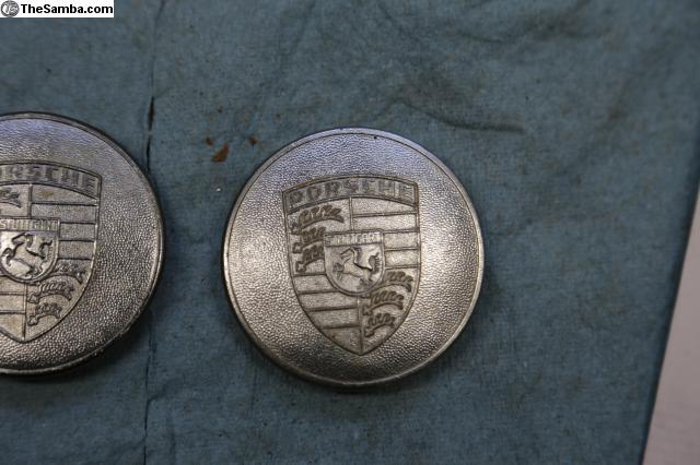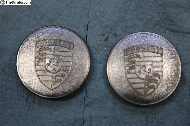 A pair of used Porsche hubcap crests, 356 911 912, originals with 3 original mounting nuts included, $40. Thanks and please see my other listings for more!