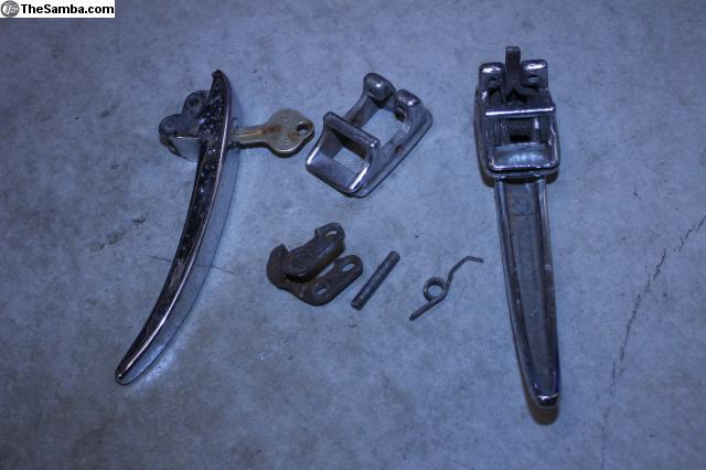 Here is a nice used original pair of 1955-60 Bus exterior front door handles. Comes with a key that works the driver's door handle. These were taken apart. Just need to reassemble.