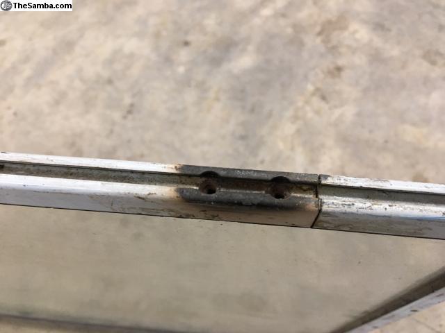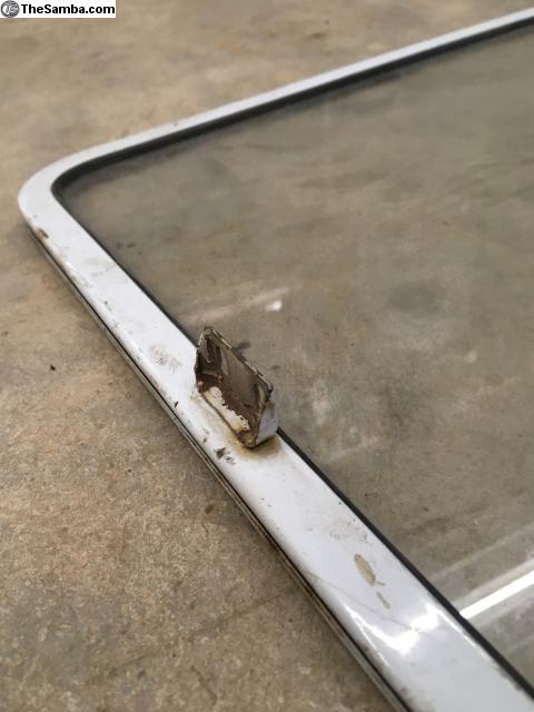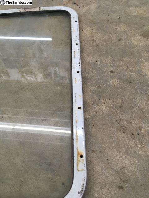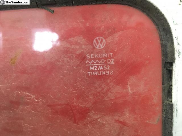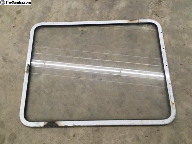 This is a nice pearl white pop out window from a later split. It has the original glass in good but dirty condition. The hinge mounting holes are in great shape, along with the latch tab. The only imperfection is the burnt paint around the half separation screws. One side they got the screws out, the other side it looks like they gave up. Price includes shipping to the lower 48, international shipping and local pickup available also.