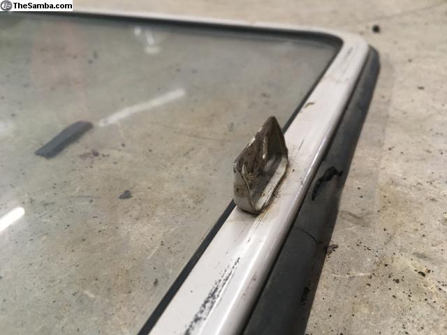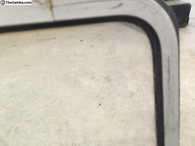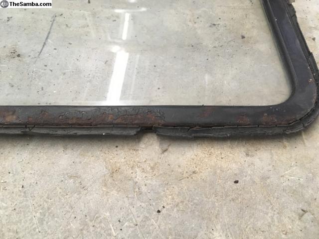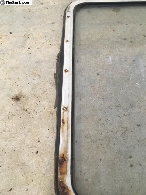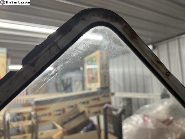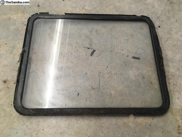 This frame has seen better days. All of the hinge screws are broken off, but the latch tab is in good shape. The lower edge is rusty and deeply pitted. The original Sekurit glass has some scratches, but is in decent shape otherwise. Great for parts or fixing up, price includes shipping to the lower 48, local pickup also available.