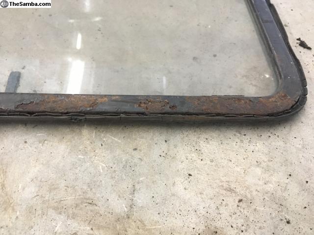 This pop out window has seen quite a bit in it's days. The lower edge is rusty and deeply pitted, and the mounting tab for the latch is busted off. The hinge mount holes all look to be in decent shape still. Glass is in good but dirty shape. Shipping included to the lower 48, local pickup also available.