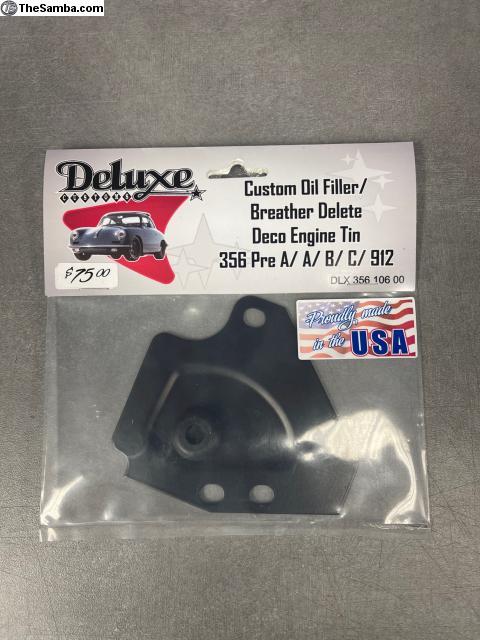 Custom oil filler/breather delete deco engine tin. Fits Pre-A, A, B, C, and 912. When switching to a later 356C oil filler or custom breather system make sure to replace the original tin with this custom engine tin. The oil filler delete comes with a grommet for the oil dipstick to prevent unwanted vibration. This custom tin doesn’t allow your engine to suck up hot air from under the car. Each piece is stamped out with an aircraft quality and precision made die. Embossing in every piece to match the original engine surround. Installs in seconds using existing mounting holes. No drilling, welding or fabrication needed. All pieces have a powder coated satin black* finish and ready to be installed. This part is designed and manufactured exclusively by Deluxe Customs.
