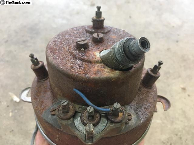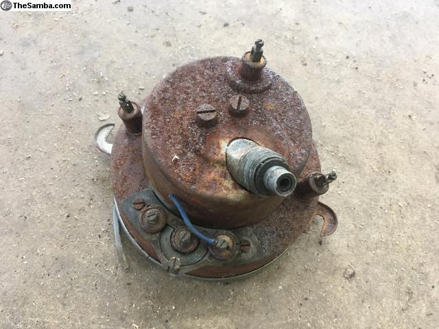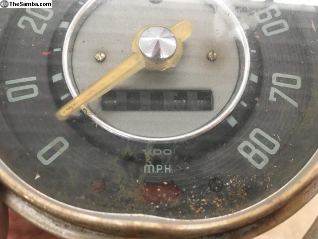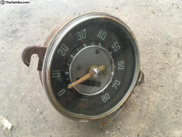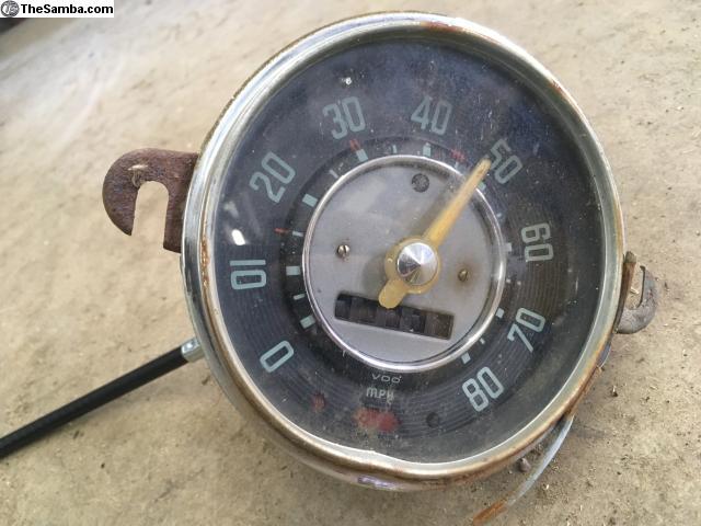 This is a decent original speedometer, removed from a 55-56 beetle. I can't read any dates on the back, it is very surface rusted. Still has the screw terminal bulb holders. I stuck my test cable in it, and by golly, it works just as it should! I didn't see the odometer move, it seems the numbers have fallen off the wheels. Obviously, this isn't a perfect specimen, but if you need a patina speedo, this is perfect! Gels are bad, of course. Restore it and more than double your money! Or run it as is! Price includes shipping to the lower 48.