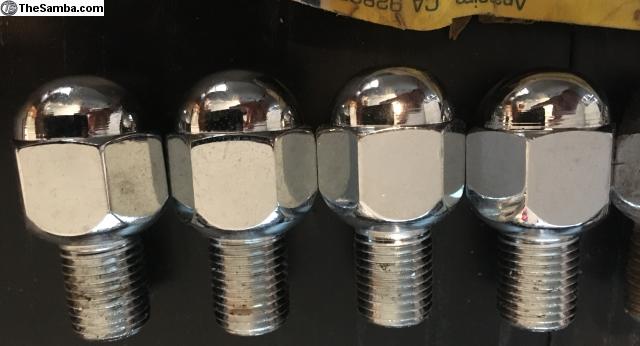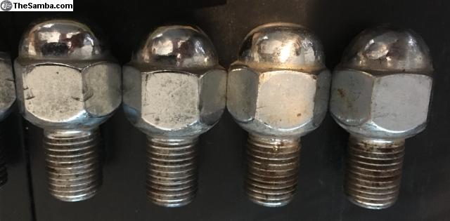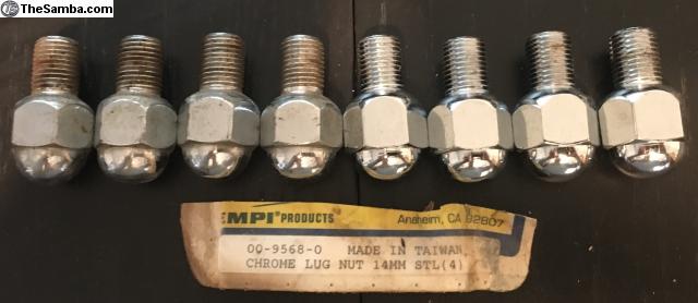 EMPI's 14mm chrome lug bolts come in a pack of 4. They are 14x1.5mm thread pitch with a ball seat and a 22mm head. These lugs are the stock thread length of 0.82" or 20.5mm. They fit stock VW wheels with the 4-lug bolt pattern, but need to be checked for clearance on aftermarket wheels. They fit 1968 to 1977 Standard Beetle, 1971 to 1979 Super Beetle, 1967 to 1974 Karmann Ghia, 1955-1970 Bus, and 1966 to 1973 Type 3 (Notchback, Squareback, Fastback).