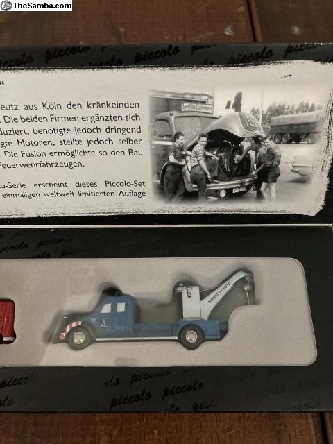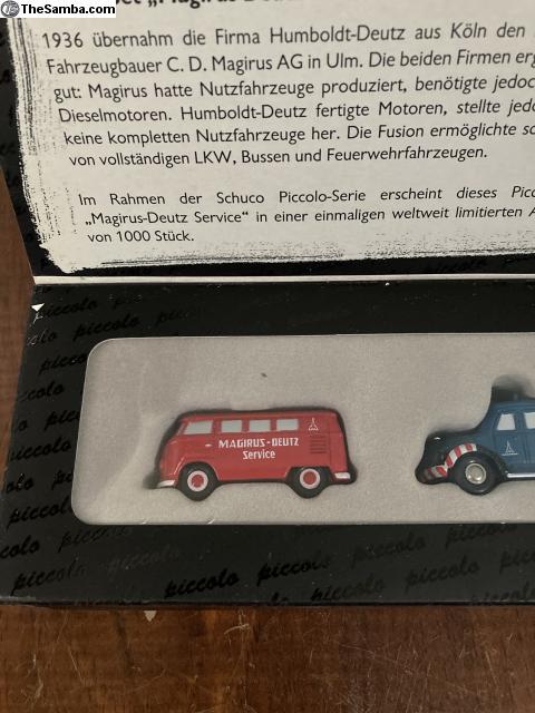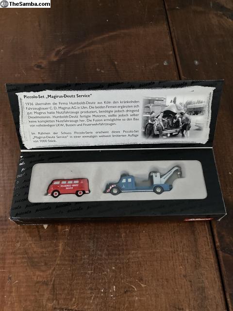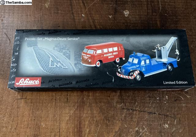 Schuco Piccolo Limited Edition 1/1000 Service Set featuring split window bus and Magirus-Deutz crane truck. Box shows some normal wear and tear, models are as new. Includes traditional piccolo storage boxes in unused condition. Overall a unique set done in Schuco style and attention to detail.