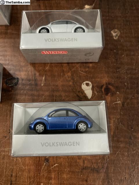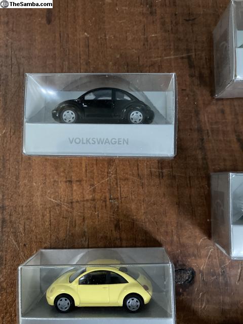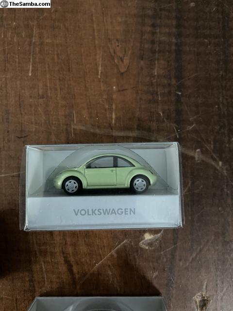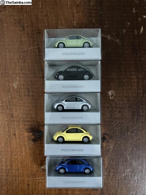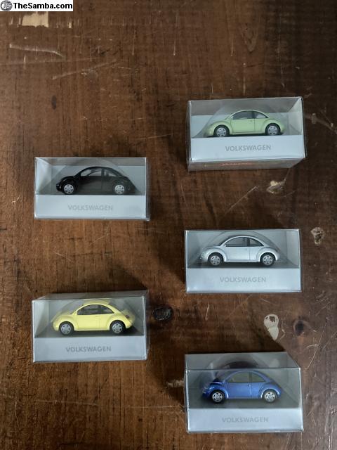 Nice collection of the New Beetle in 5 different colors. 1.87 Scale. Green, Yellow, Black, Silver, and Blue I believe these were licensed VW and sold at the dealerships. This may be every color they made.