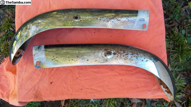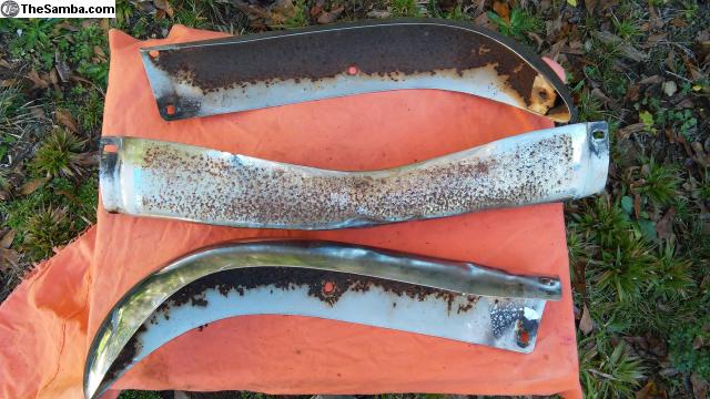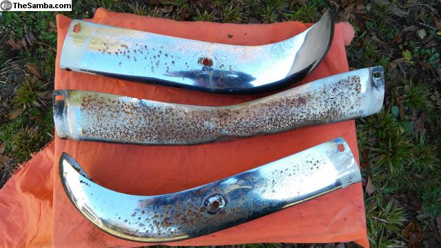 Earlier Ghia front bumper blade. The center section does need some work on a press, but would straighten out good enough to be presentable for a driver. Heavy surface rust on some of these, but no thin spots that I could see.