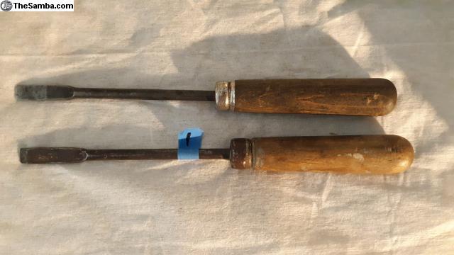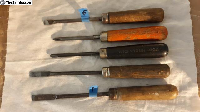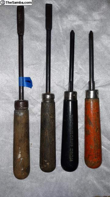 i have 5 original wood handle vw screwdrivers , from the original roll up tool kits . the big blade one is used for holding the generator pulley wile you loosen the nut . 100 each plus shipping .