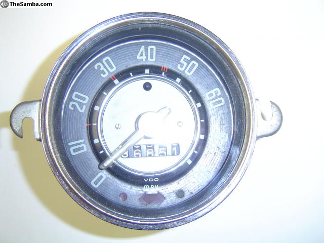 Used Beetle speedometer in great condition. Checked with a small section of cable and battery driven drill to work. It seems to function smoothly. The face and needle are in nice condition. Red and green films are in place. Date on the back is 2/58. Price is $115 shipped in the lower 48 US States. Please check all my adds for great deals on Vintage Parts. Thanks