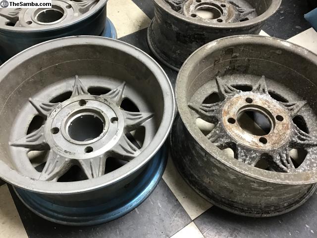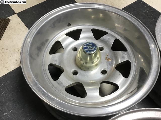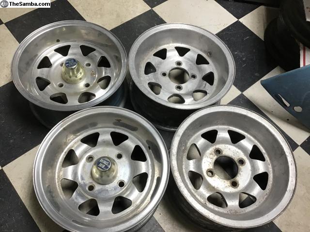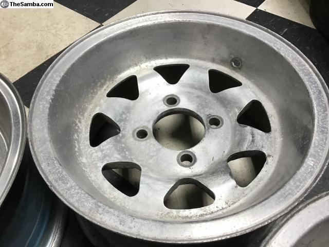 An original set of Gurney wheels. These have a deep dish compared to others. Two have been polished and look great. The other two need it! They are two different pairs, slightly different profiles on lips, hardly noticeable, we didnt see it at first. and the mounting surface is different, there is a 3mm backspace variation between the two sets, the car wont notice! No major gouching in lips, will clean up easy. Not sure if the center caps are correct but were all together