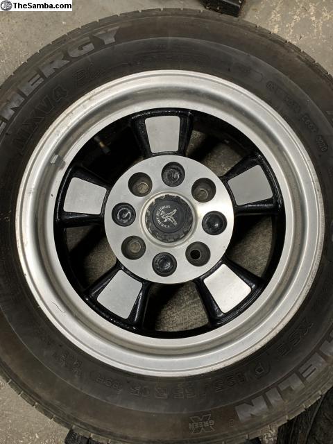 Set of 4 classic riviera wheels, the fronts are stock 5.5” width, the rears were professionally widened to 7” ( 1.5” was added to the backspacing) approx 5 3/8 backspacing on the rears… rear wheels take tubes… tires are free, will come with tubes… I can remove tires and ship at buyers expense.