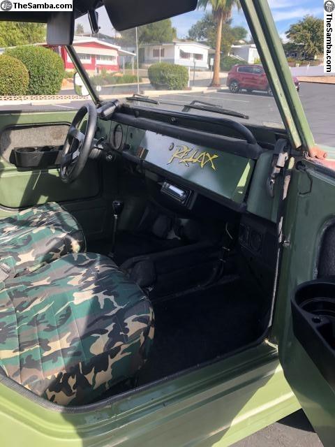 1974 Volkswagen Thing, original color-Avocado Green, new vinyl top & 4 locking glass door windows, front disc brakes, engine size-1835 with dual weber carburetors (runs great). Small dent front right fender & back right fender. Rear bumper not shown but I do have it.