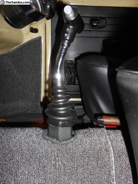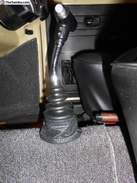 This Basket Weave vinyl cover slides over the exposed cast base of the Gene Berg® non-locking shifter to add a finished look to the unit. The recycled Basket Weave black vinyl came from the old seat covers on my 1971 Super Beetle and matches the side panels of the 1968-1979 Type 1 seat. No modification required: cover simply slips over the base and is snug to the lower rubber boot of the Gene Berg® shifter (10 second installation). Lower edge of cover rests on carpet.