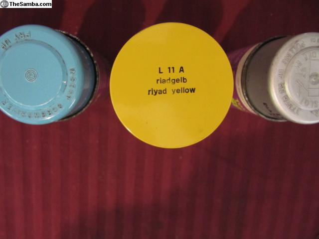 Vintage spray touch-up paint lot. For display only. Includes: L19K Yukon Yellow, L51C Miami Blue, L11A Riyad Yellow and L97A Diamond Silver Metallic. Price is for all four cans shipped. Any questions email or call Fred.