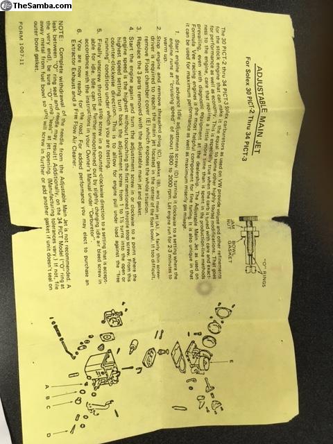 Bugpack adjustable main jet for solex 34 pict carb. new but been sittng around a long while. seems to be all there including directions. never used it , might be fun to experiment with. read some forums, most were not positive so try it out at your own risk. just $10.00 plus shipping. small box usps priority mail is $8.50.