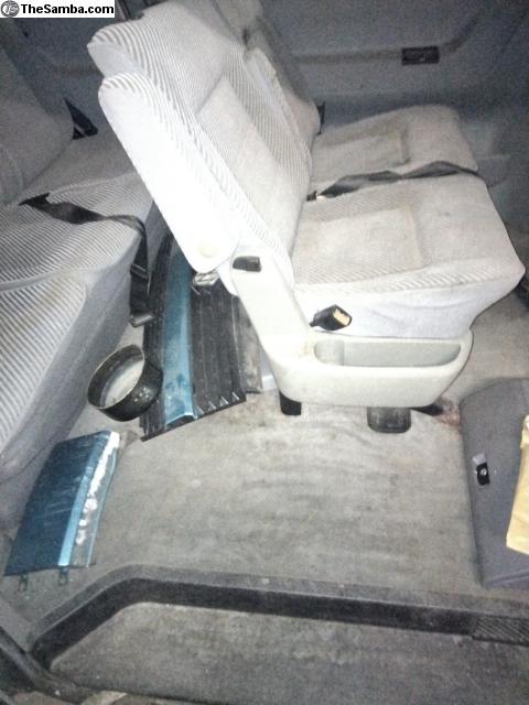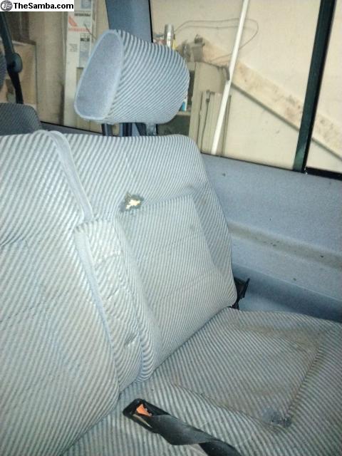 I bought this 1993 Eurovan automatic many years ago, 2005 maybe? It's been inside most of the time. Never got around to fixing it. Pretty low miles at 112k. The 5 cylinder code AAF petrol engine was badly overheated. Engine is probably rebuildable with a different head or welding the head. These motors will go long miles if you keep up with the plastic cooling system fittings. (I've heard over 300k!) It's Jamaica blue metallic code LL5V. a pretty neat color. The paint has several spots of surface rust, but I'd try to blend them in if you like the color. Since it has been sitting so long, it will of course need brake hydraulics and fuel system flush. And tires. It has a few mouse holes in the center and rear seat.