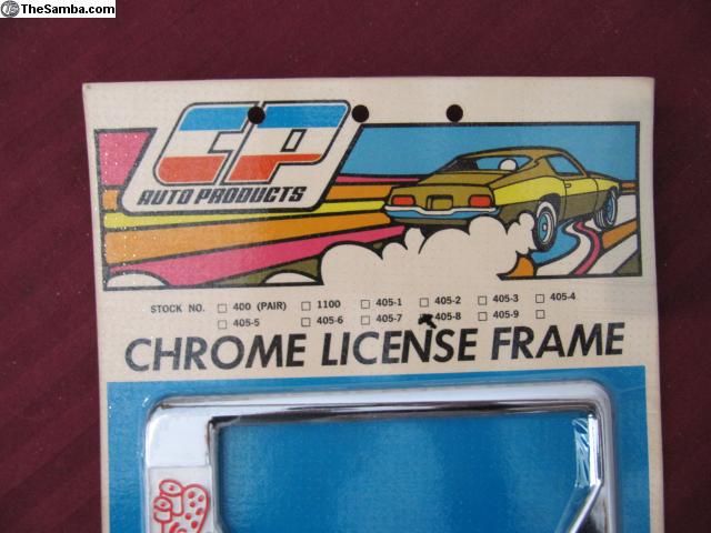New Old Stock in original never opened packaging. Packaging in very good condition. Colors are fantastic. CP Auto Parts (Custom Plating Corp, Los Angeles, Calif.) Part number 405-8. Red lettering over white background. Chrome frame. Copyright date 1971. Any questions email Fred.