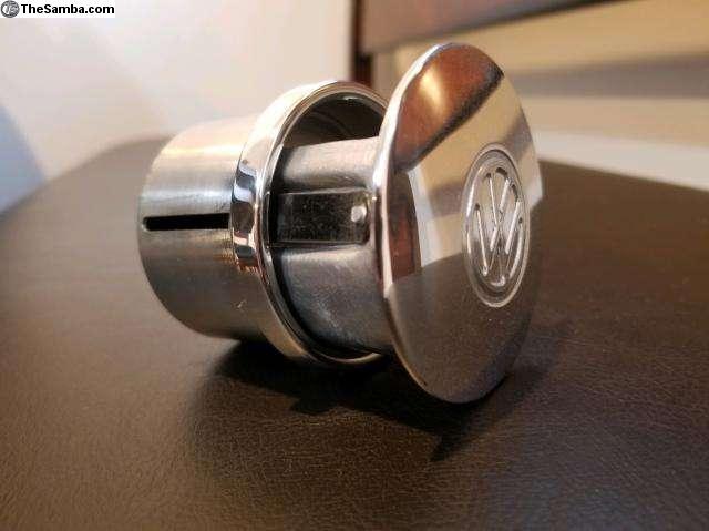 Here is a replica of the hard to find Split window/Hebmuller glove box ash tray. Its spot on to the original ones, from the stamping of the VW logo to the rivet holding the retaining clip and the bracket that holds the ashtray into the glove box. They are fully functional and work exactly like the original ones (as seen in the above picture, installed in OG glove boxes).
