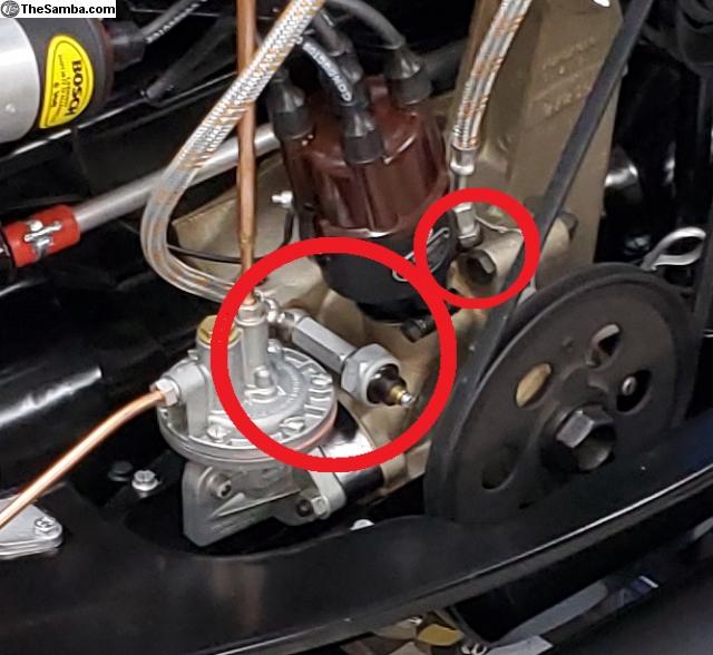 I had my machinist make up the "special" oil fittings at the oil pressure switch (outlet) and oil return (dist. stud) back into the block for mounting the popular FRAM oil filter kit to your Okrasa engine. These are duplicated using an original sample. They use the correct 14mm wrench and have the correct oil control orifices to maintain proper oil pressure (very important) within your engine. The long hex fitting is identical to the early Porsche 2pc. engine but sells for about 1/2 price!