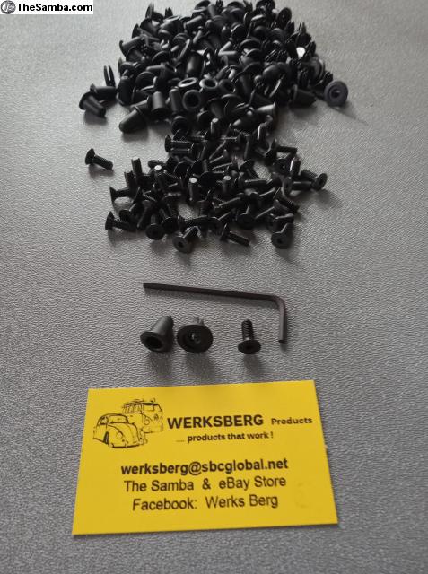 Description: Bug ABS black or GREY interior panels, 4x with fastener kit (Rubber boots, special molly's and metal center screws) Insert fastener rubber boots into the door steel holes, ABS Panel, Molly and then use the metal center screw and only use a hand screwdriver to tight them down.