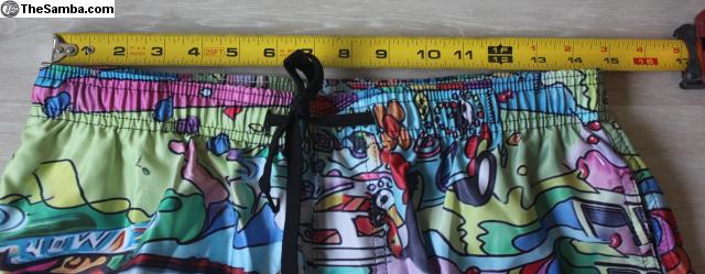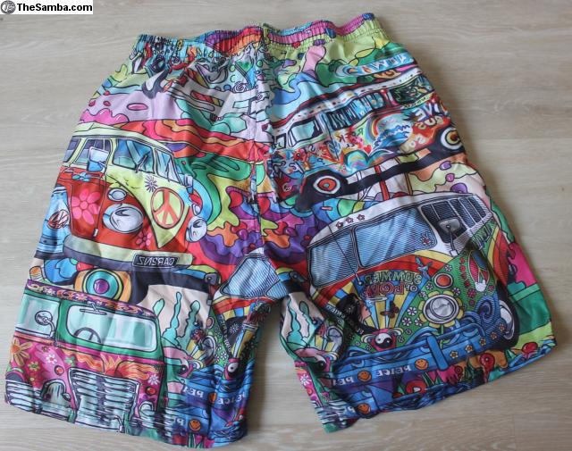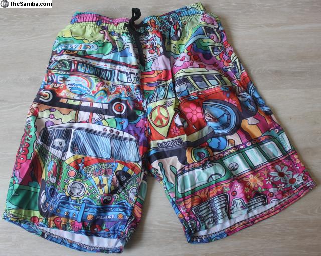 This is a new, never worn pair of Composition 100% polyester XL (actually closer to a L) swim shorts with pictures of Volkswagen buses.