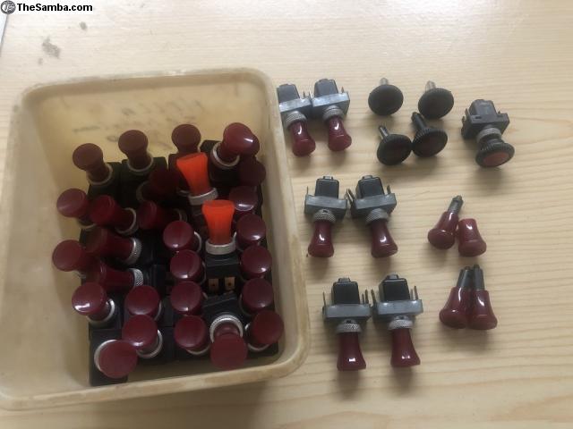 old garage stock. A number of Hella red fog light switches. Price is per piece. Taking over the entire lot or part of it at once is also possible. make me a good offer. I think the switches are all new The six switches on the rightside are older and look as if they are used..