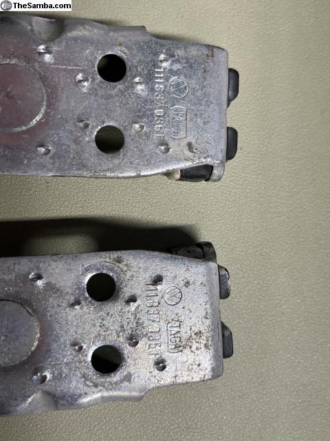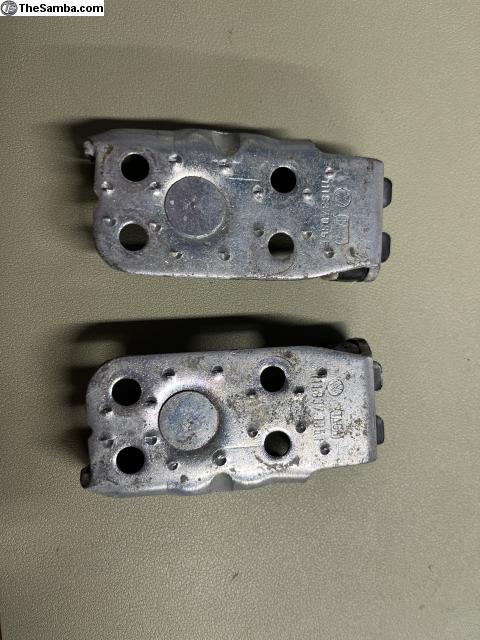 Good condition used left & right striker plates for all beetles 73-79. Bumpers are in good shape. No cracks. Striker pins aren't excessively worn. In really great shape. One plate has one side that has been painted white (pictured).